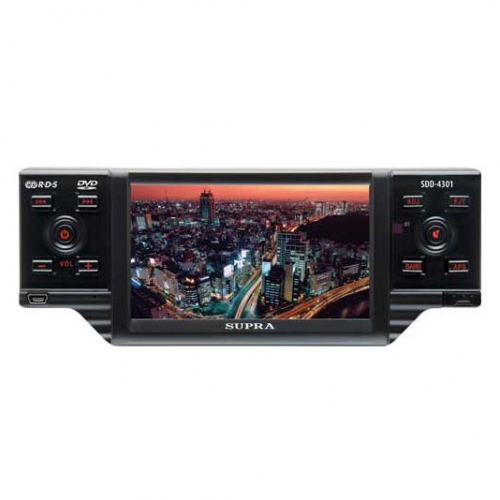 SDD-4301 - CD/DVD - автомагнитола. Краткие технические характеристики: 4x50 Вт, цветной сенсорный дисплей, усилитель, эквалайзер, FM/AM радио, CD-R, CD-RW, DVD-R, DVD-RW, MP3, WMA, MPEG4, JPEG, miniUSB, слот для карт памяти SD/MMC, пульт ДУ.